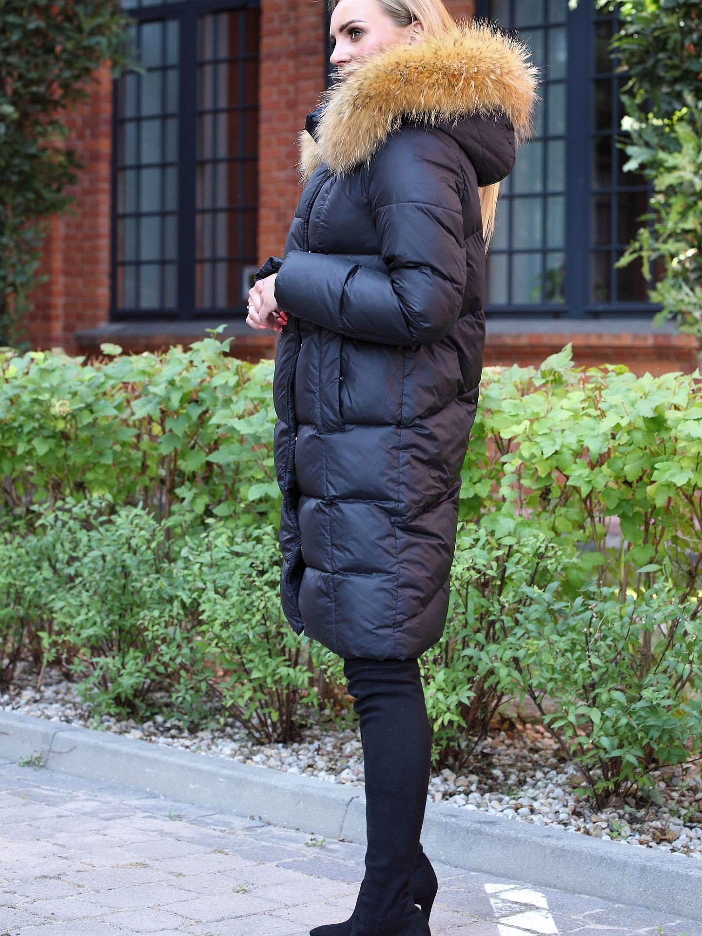 Kurtka damska puchowa z naturalnym futrem przy kapturze kolor Czarny