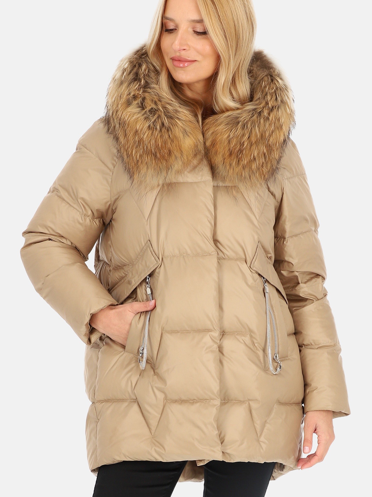 Kurtka damska puchowa d?ugo?ci ? z futrem jenota kolor Be?owy