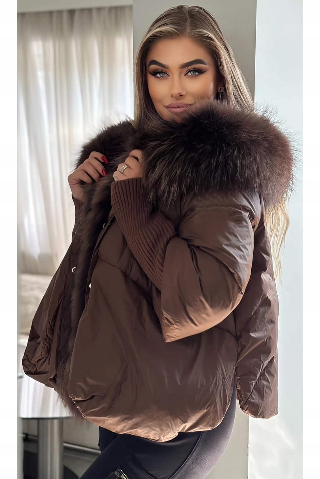 Kurtka z kapturem puchowa z naturalnym obszyciem br?zowa M